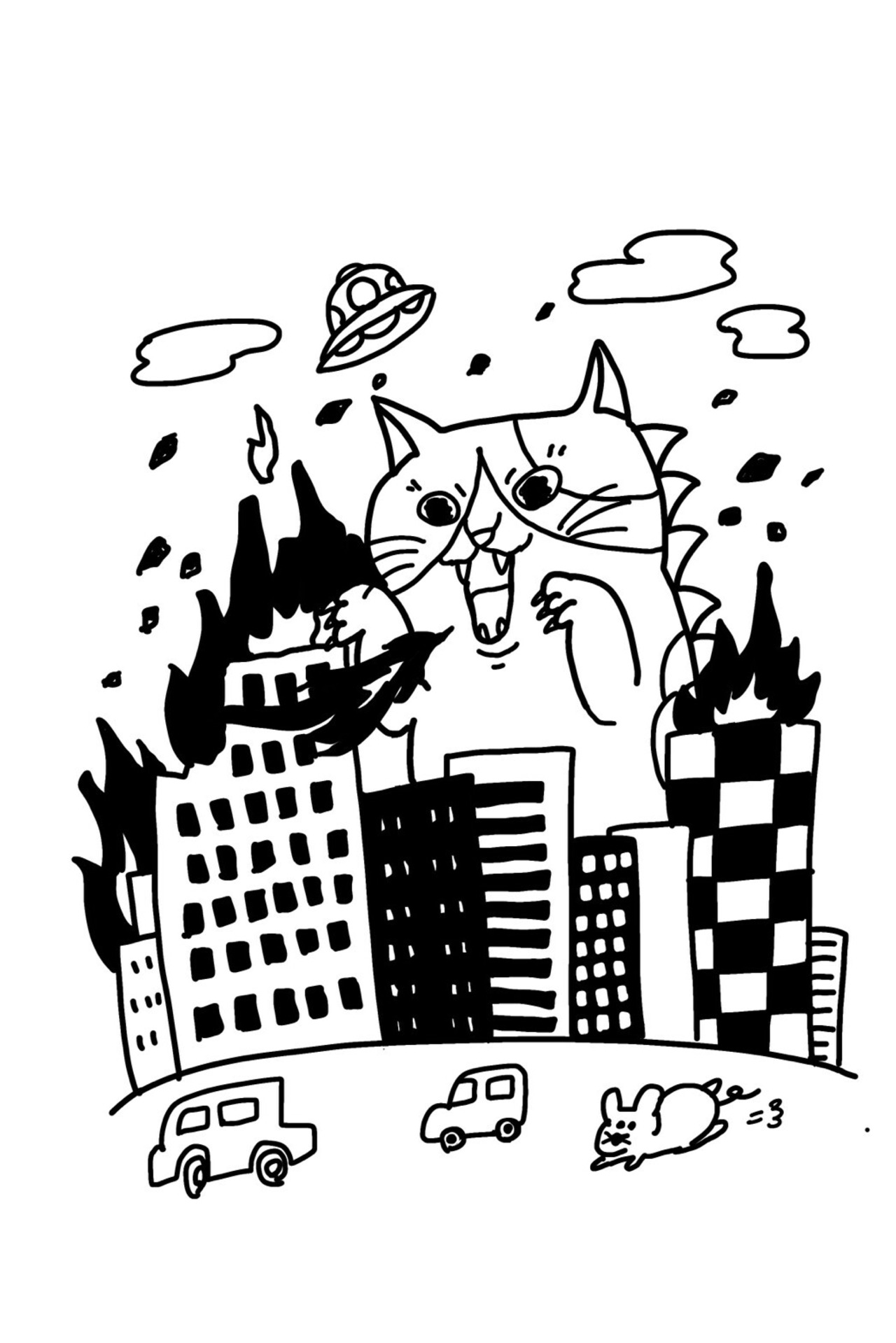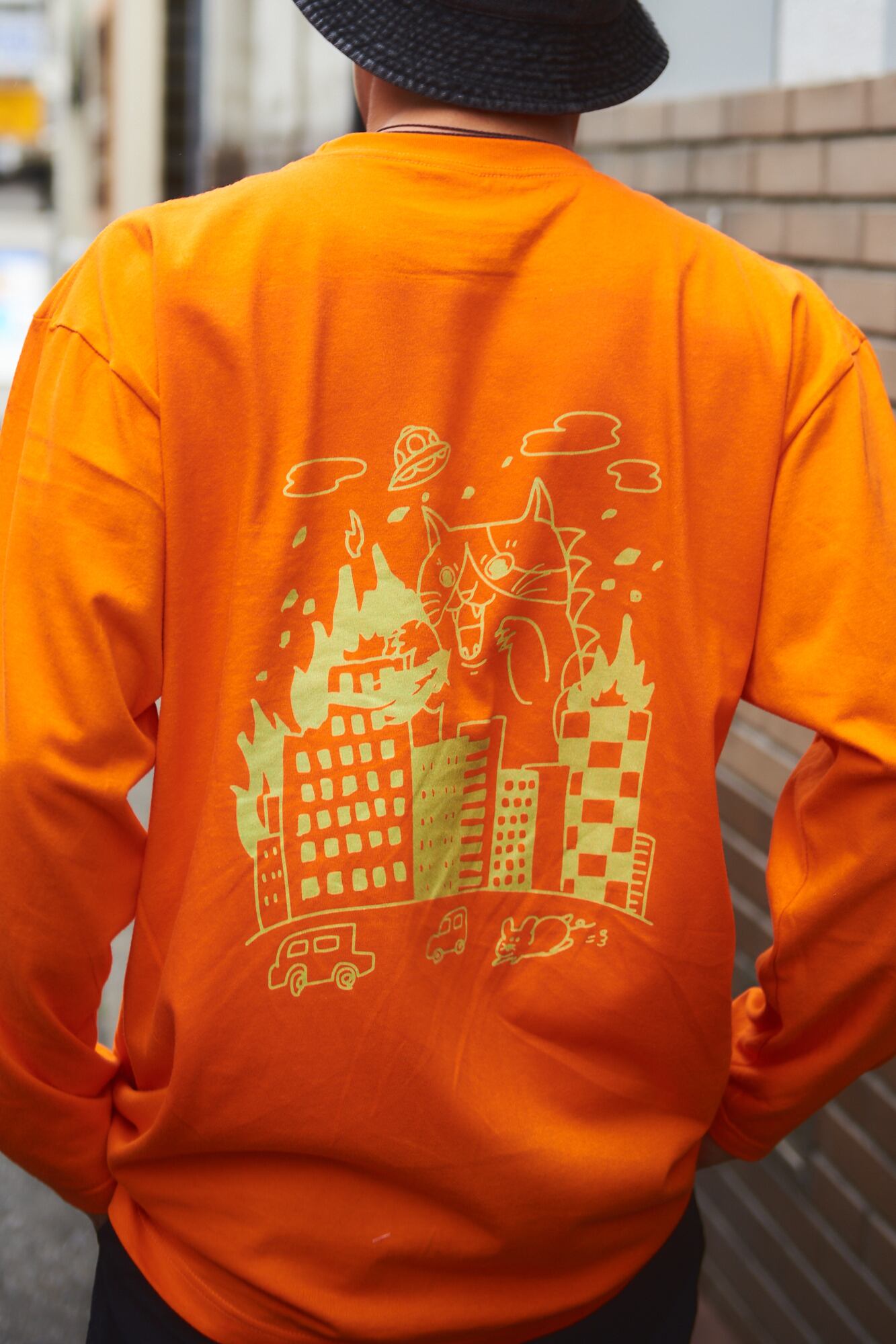 ■背景には大怪獣ニャジラが街を襲うイラストをデカデカとプリント!
